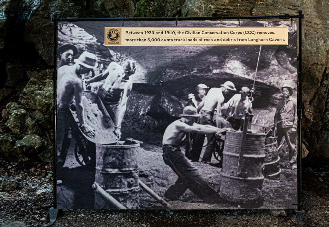 Previous ImageNext Image 20211106 Longhorn Cavern 20211106 Austin to homeDSC00127 “Between 1934 and 1940, the Civilian Conservation Corps (CCC) removed more than 3,000 dump truck loads of rock and debris from Longhorn Cavern.”