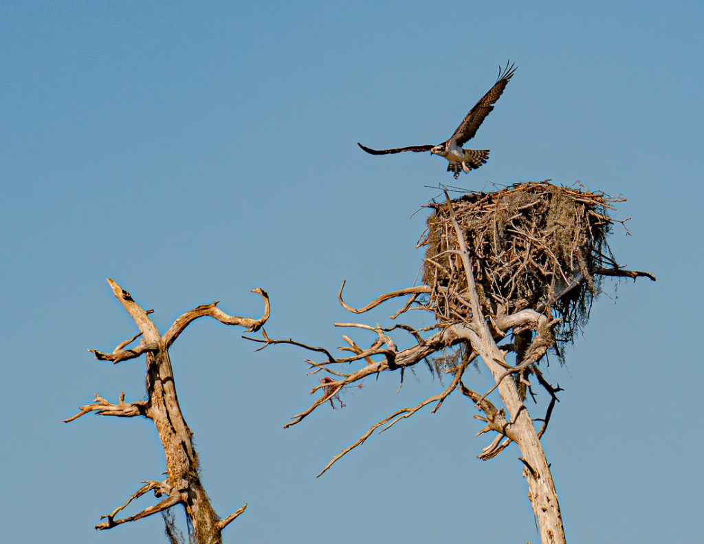 Osprey flying from nest to nearby trunk