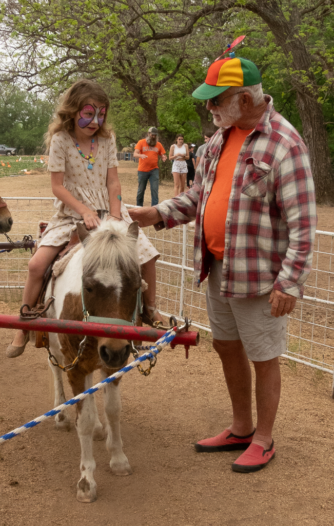 Stu helps Sierra get on the pony.