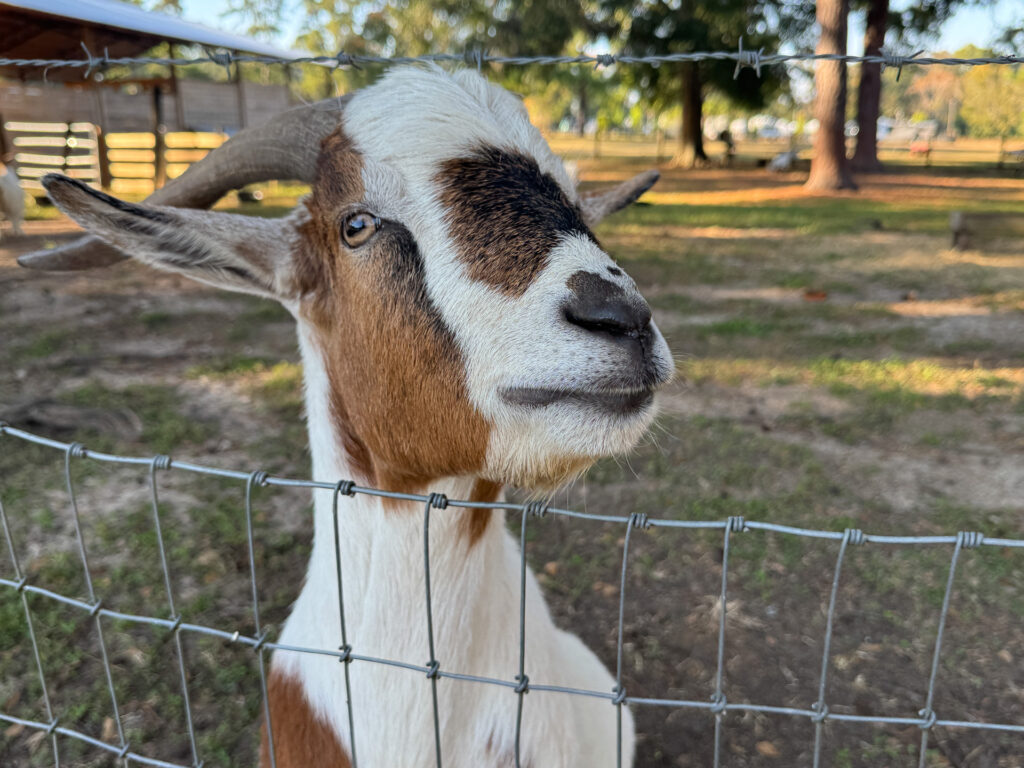 Rescued animals roam in the fenced area behind the campsites.