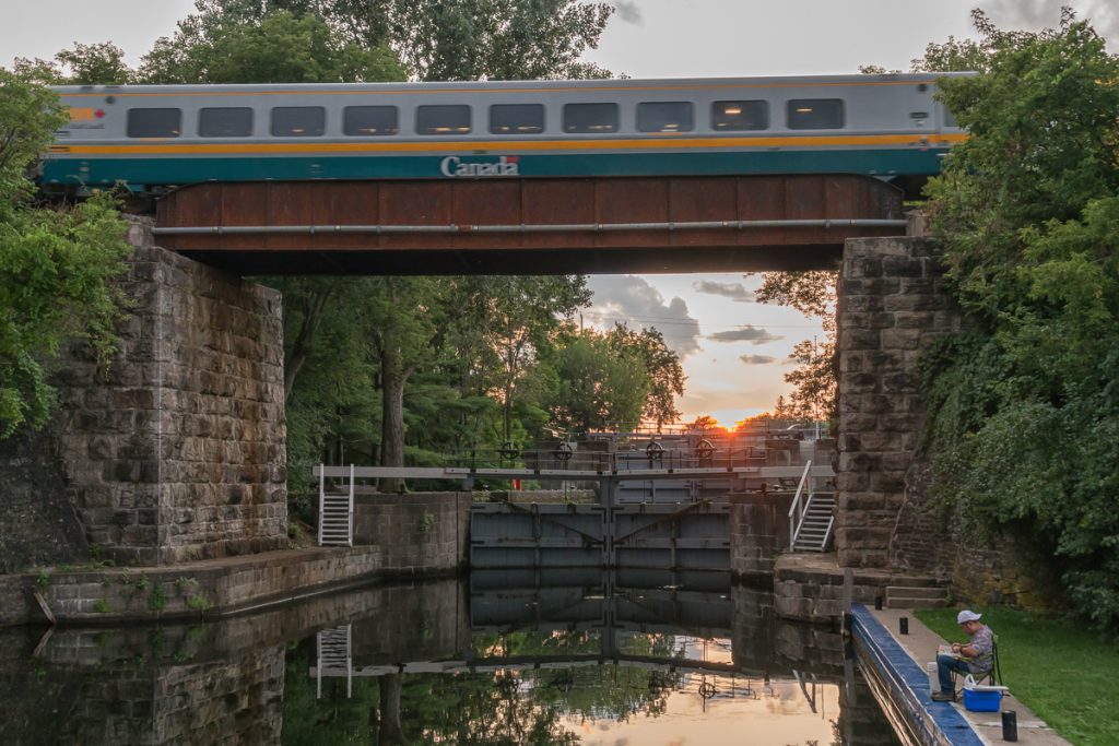 Previous ImageNext Image 20180807_to_Old_Slys_0004 Docked for the night at Old Slys lock with trains going by overhead.