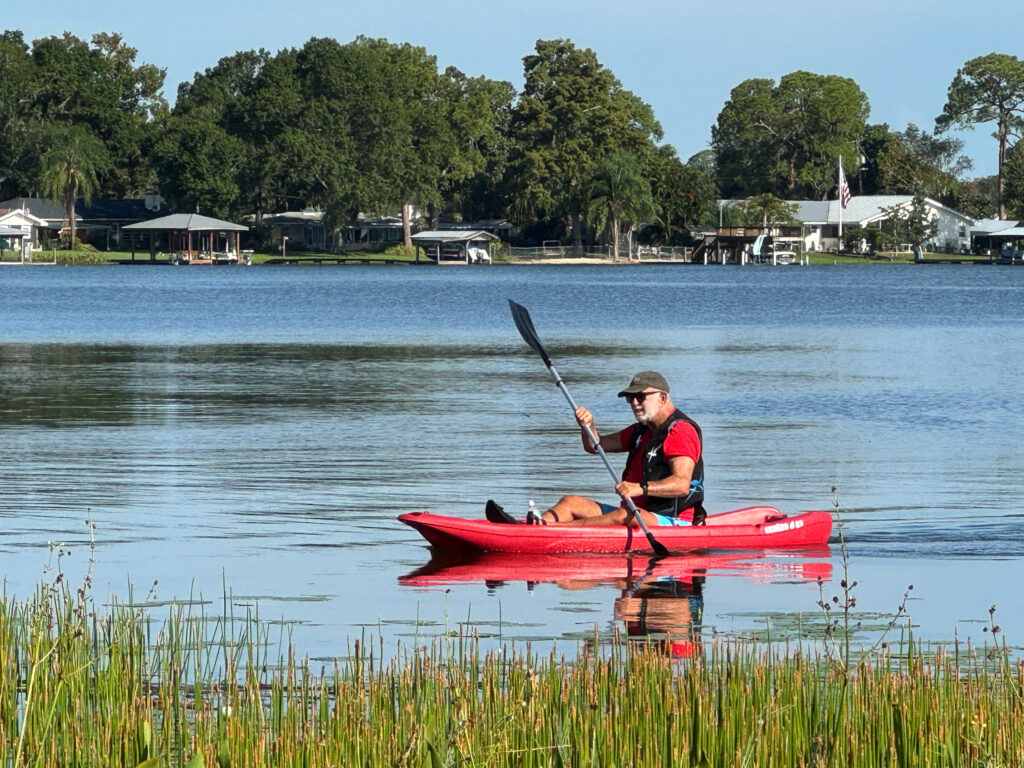 Previous ImageNext Image 20250805_Stu_kayaking_near_Moose Stu had transported his kayak on the back of Josephine, along with his electric bike, and the kayak was a wonderful addition to our accessories.